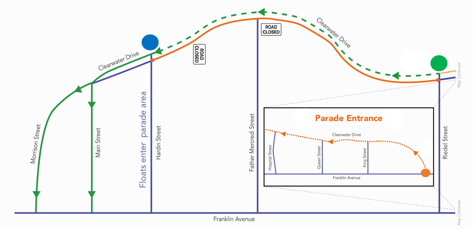 Spectators are encouraged to enter the parade route at the intersection of Franklin Ave. and Clearwater Dr., near Home Hardware. Spectators cannot enter the drive-thru parade from the intersection of Riedel St. And Clearwater Dr. Businesses along Riedel St. will continue to be accessible.
