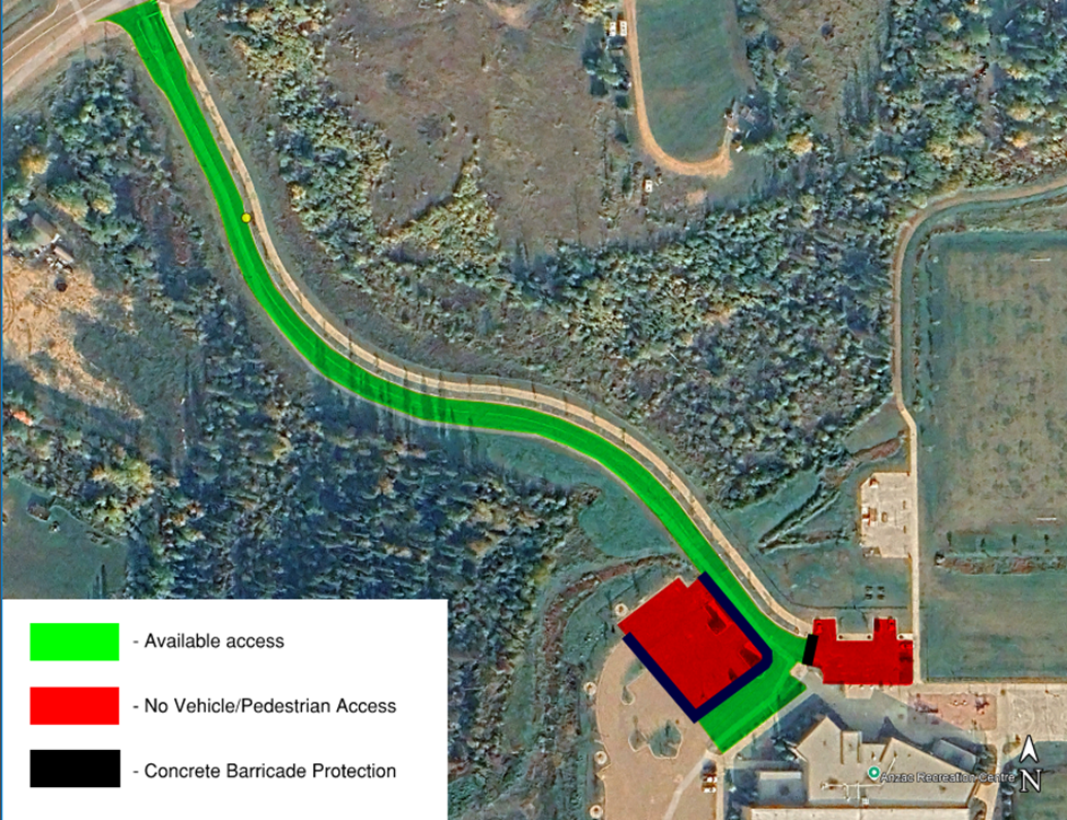 The Anzac Recreation Centre Culvert, Asphalt, and Curb Replacement project will have a winter shutdown and resume operations in 2026. The Main access road and a section of the parking lot will be open to the public. Concrete barricades will be placed along the “Do not Enter” areas for pedestrian safety.