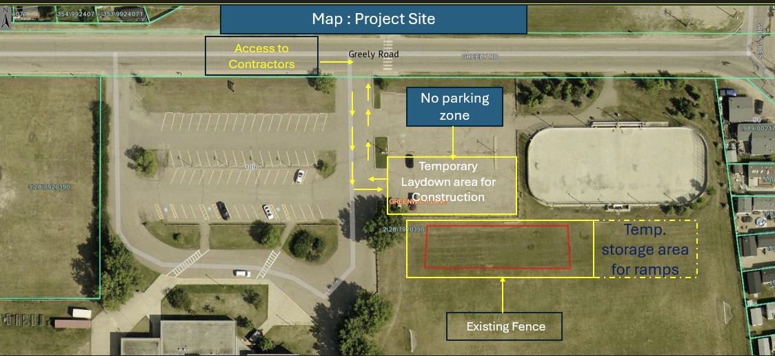 The skatepark development project at Greely Road in Gregoire, involves the construction of a concrete slab, installation of modular skate components, and landscaping surrounding the skatepark.