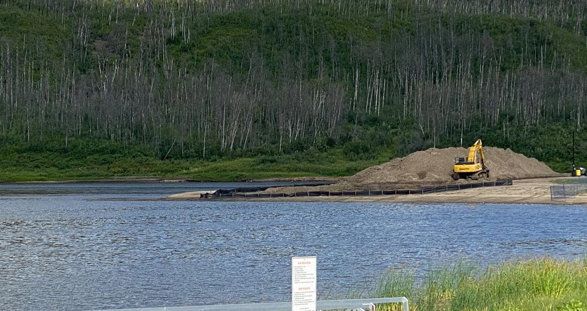 The mouth of the Snye fills with sediment deposits (silt) brought by the current of the Clearwater River. Each year, this silt is dredged (removed) from the river to maintain an access channel. This year's dredging operation is expected to be completed by mid-September.