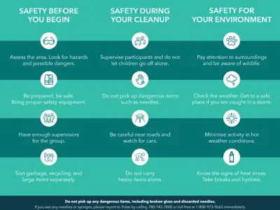 - Do not touch, disturb or pick up any items you are unsure of, such as needles, syringes, or chemical and pesticide containers. Report them to PULSE immediately by calling 780-743-7000 or toll free at 1-800-973-9663.