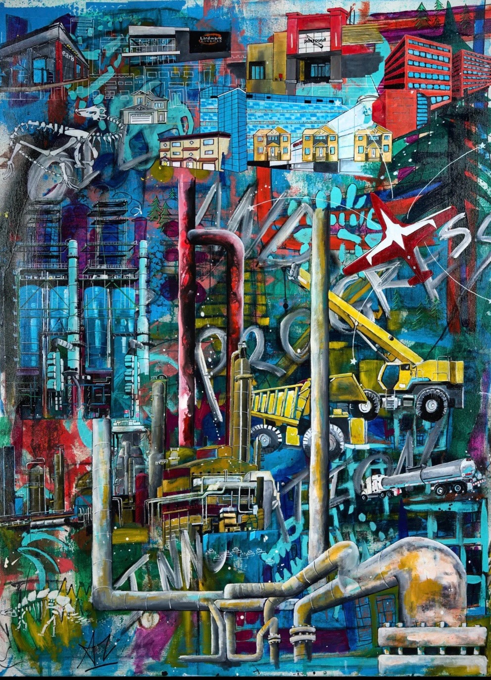 Alexandra Kavanagh is a dynamic Canadian artist whose bold, vibrant style transforms industrial landscapes into captivating works of art. Raised in Quebec and now residing in Fort McMurray, Alberta, she brings a fresh perspective celebrating the innovation, energy, and community of the oil sands. Alexandra blends her love of architecture, design, and colour to paint the world around her. Her work invites viewers to see industry through a new lens: bright, powerful, and full of colour.